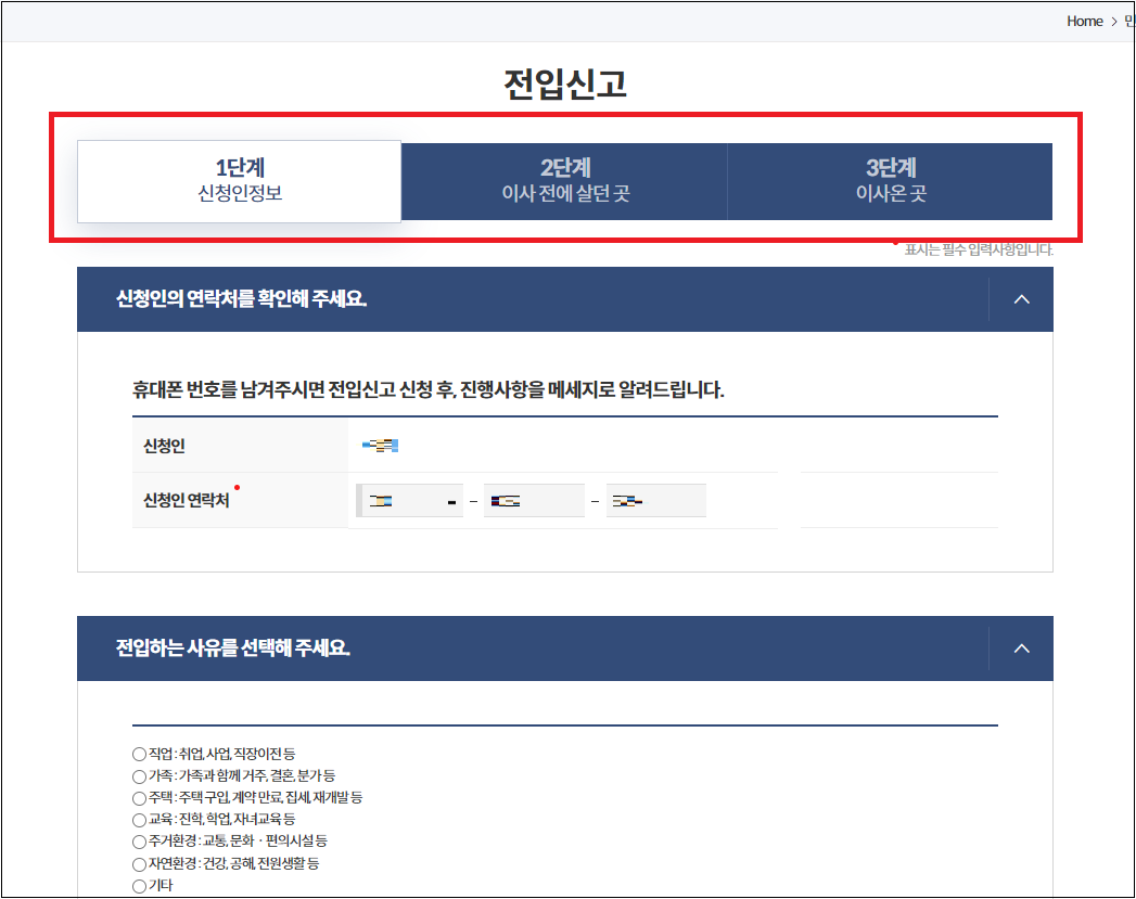 ◎ 전입신고를 신청하는 신청인의 정보와 이사 가기전의 주소, 이사 가는 곳의 주소를 입력하고 진행하면 전입신고가 완료됩니다. 주소를 기재할 때는 동호수를 정확하게 기재해야 합니다. 만약 잘못 기재하는 경우 대항력 확보를 하지 못할 수도 있기 때문에 상세주소를 꼼꼼하게 체크해야 합니다.