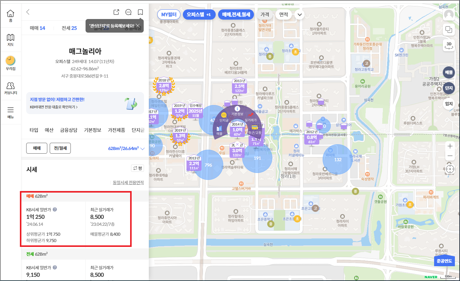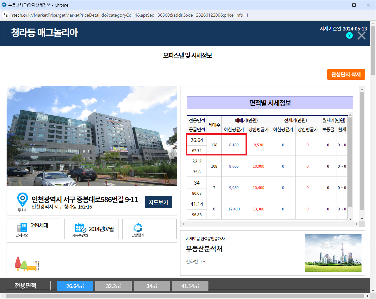 ▲ 시세를 조회하고싶은 오피스텔 단지를 찾아 클릭하면 좌측에 해당 오피스텔에 대한 정보가 나옵니다. 빨간색 체크박스로 표시된 부분을 클릭하여 해당 단지에 있는 여러 면적 중 조회하고 싶은 면적을 선택합니다.