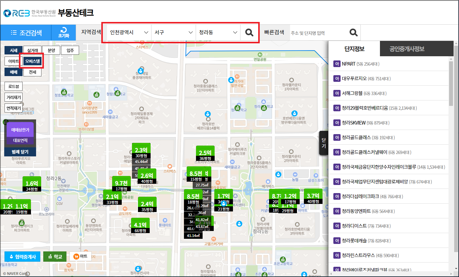 ▲ 시세조회 화면 상단에서 조회하고 싶은 오피스텔이 있는 지역을 검색하고 오피스텔로 체크하면 해당 지역에 있는 오피스텔들이 나옵니다. 여기서 조회하고 싶은 오피스텔을 클릭합니다.
